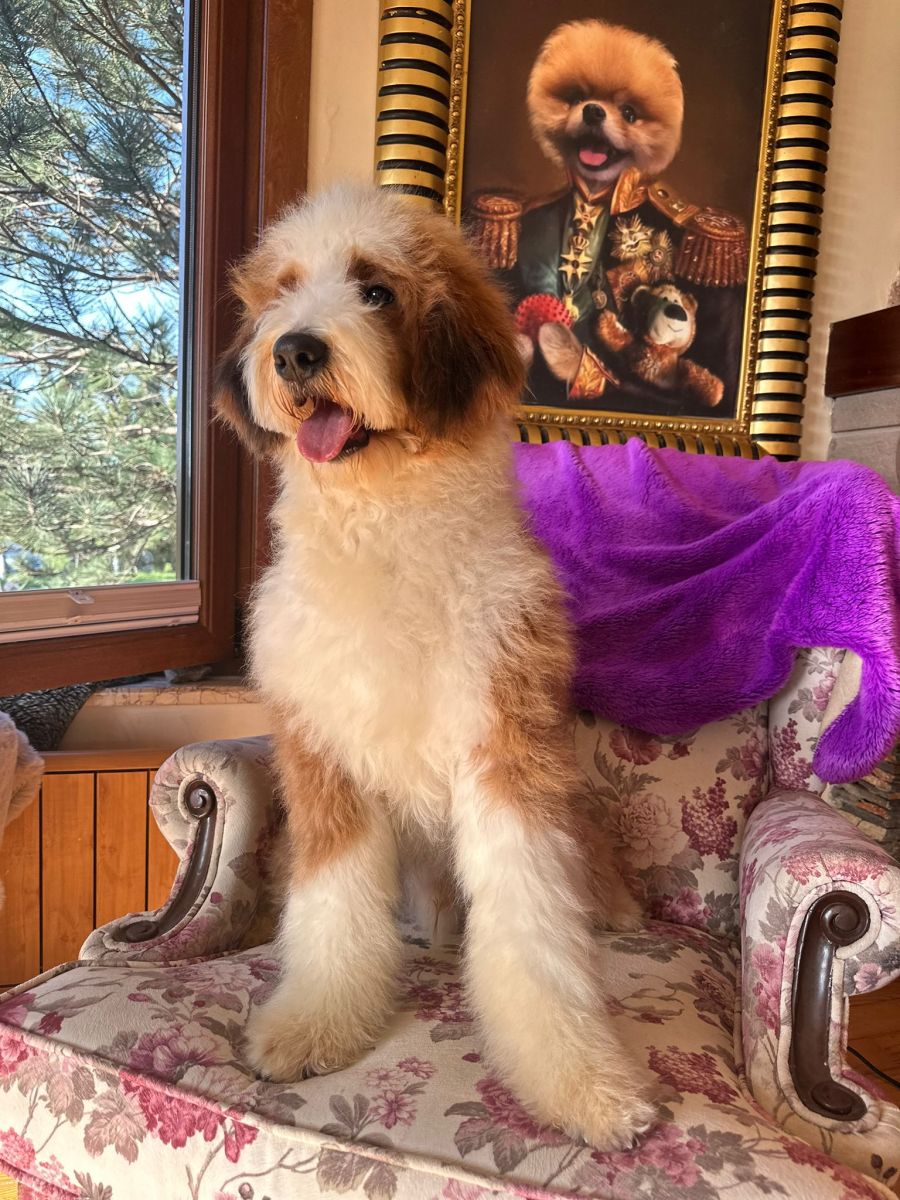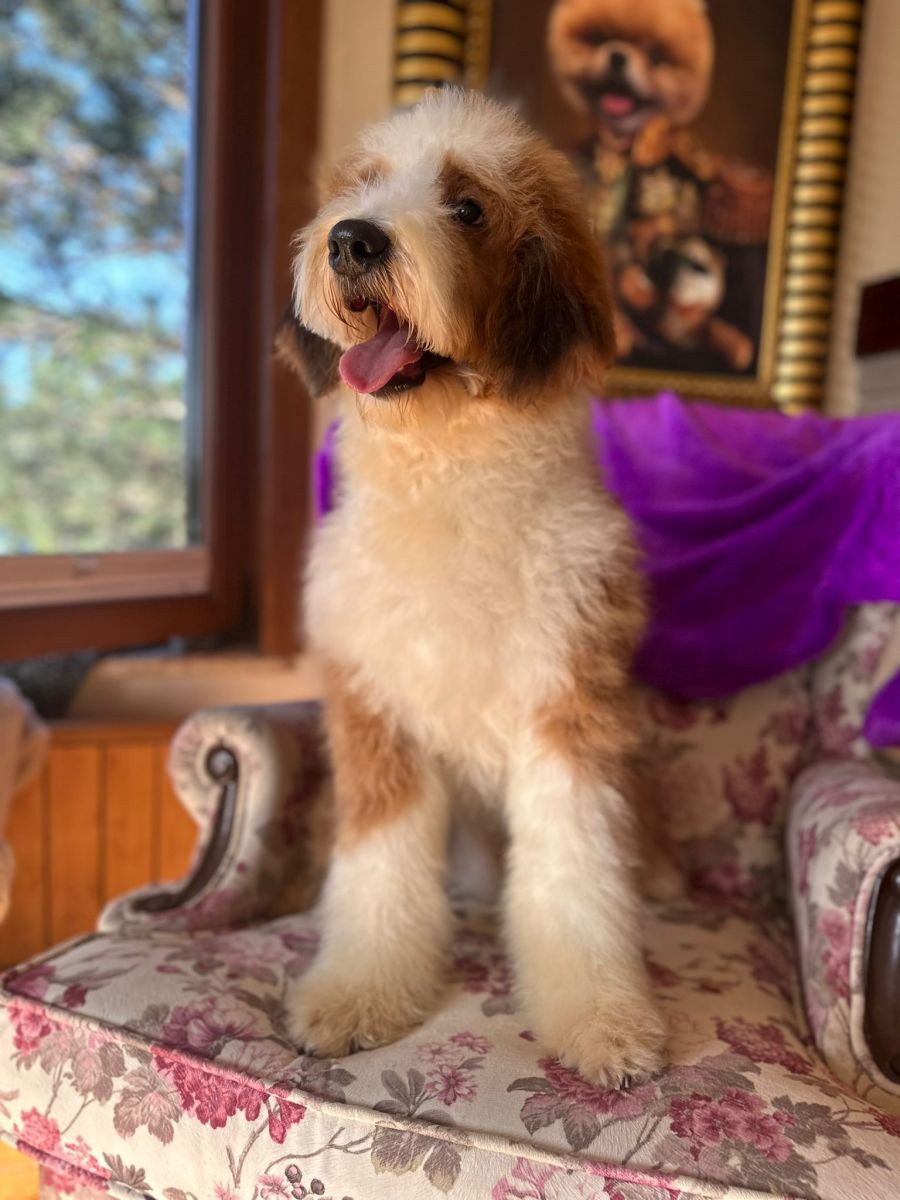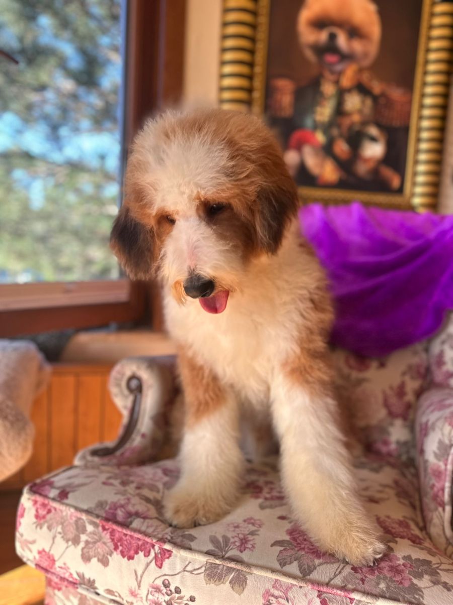 Here’s Barney, a vibrant and lovable 11-month-old red and white Bernedoodle who is eagerly waiting to bring endless joy and companionship into your life!