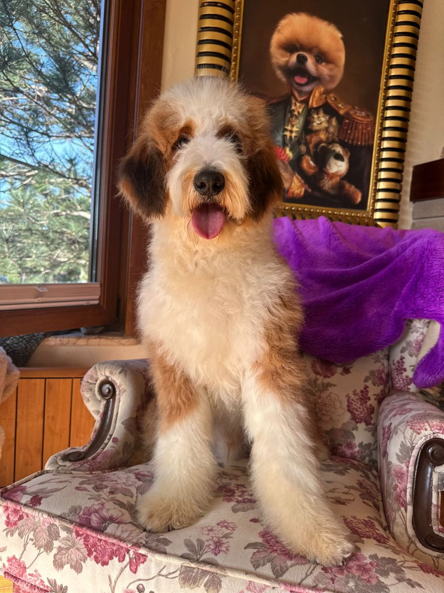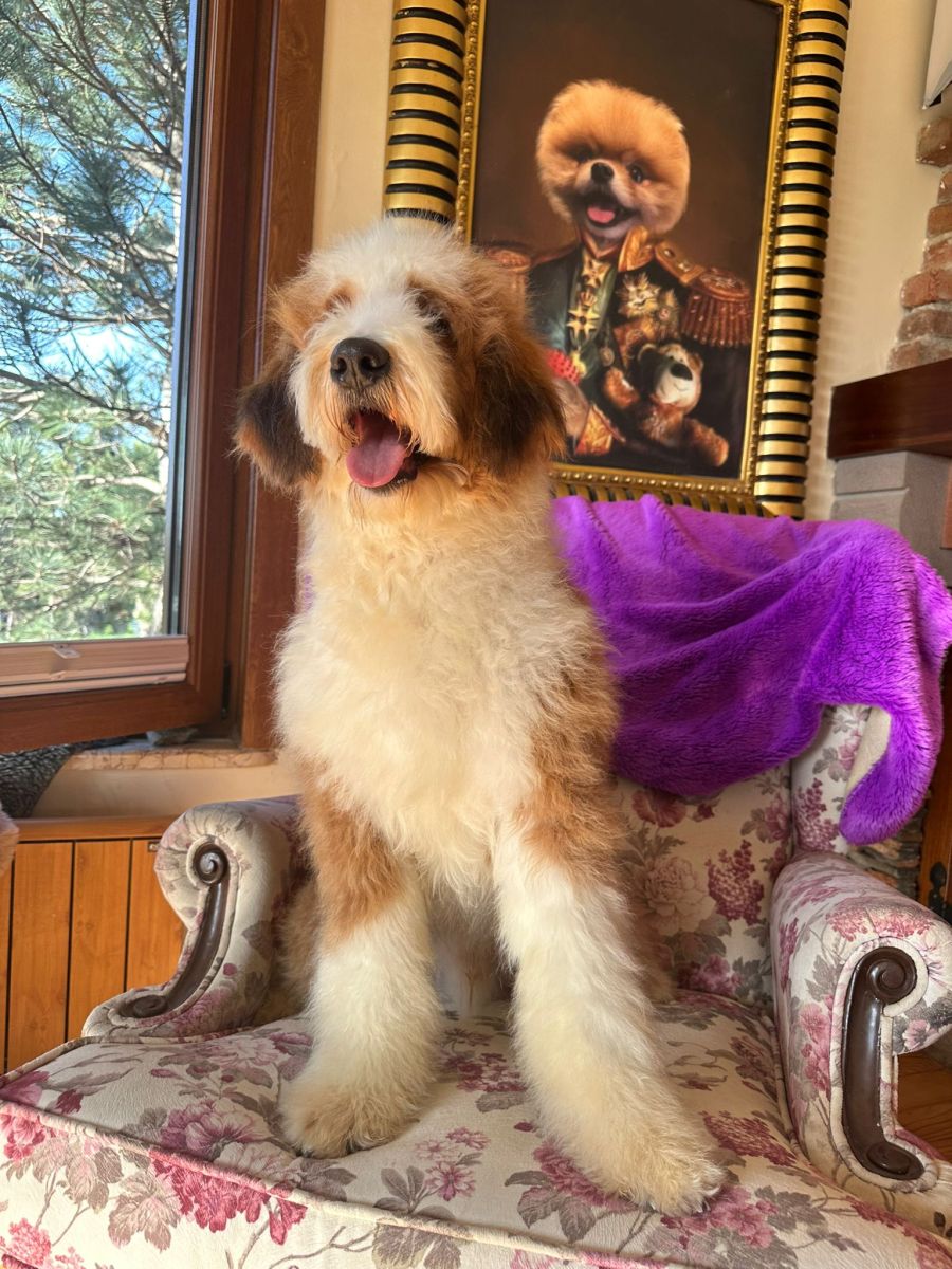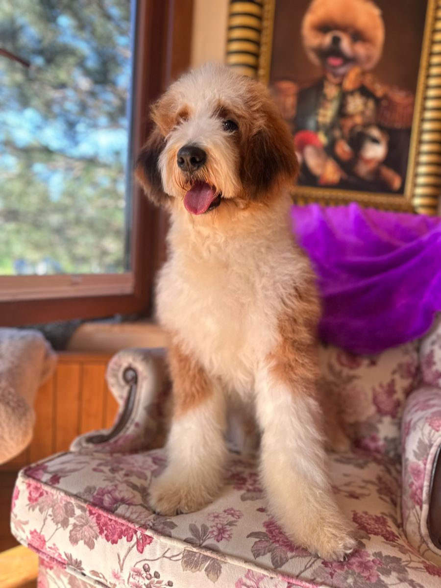 Here’s Barney, a vibrant and lovable 11-month-old red and white Bernedoodle who is eagerly waiting to bring endless joy and companionship into your life!