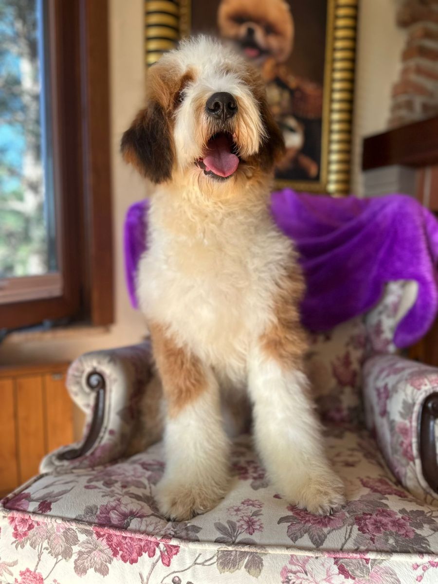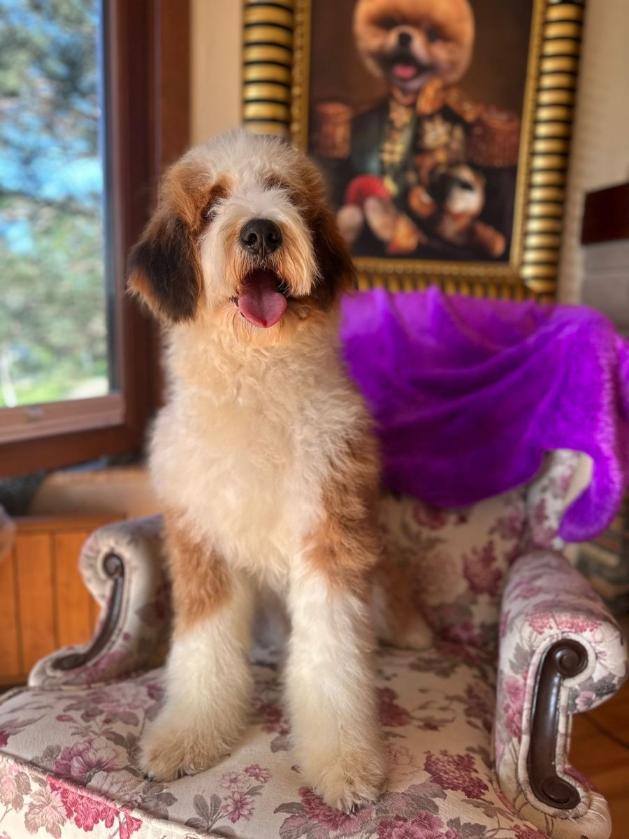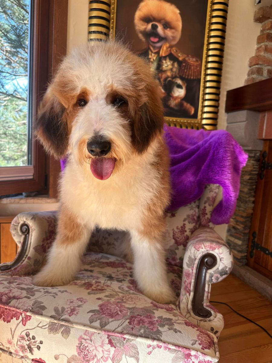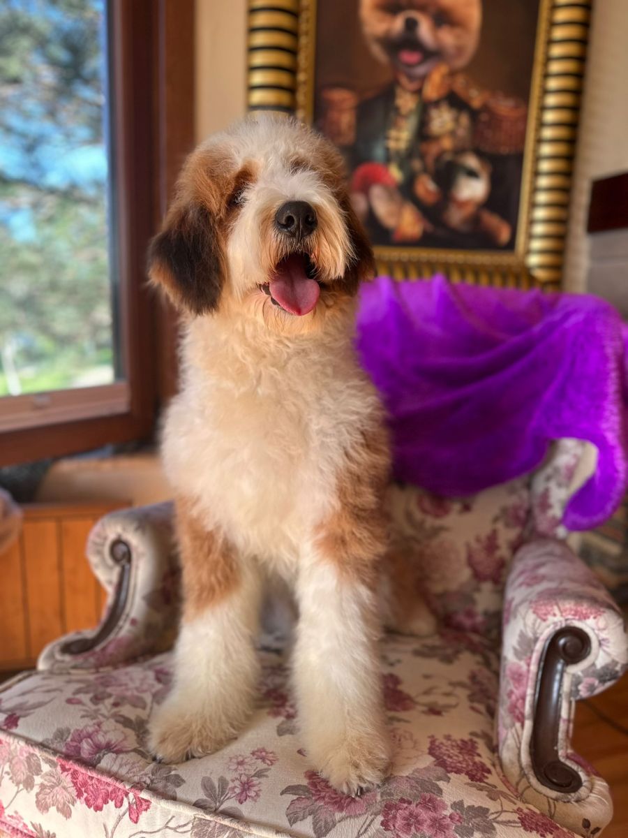 With his eye-catching coat and warm, affectionate nature, Barney stands out as a truly special companion. This standard-sized Bernedoodle has a playful yet gentle temperament, making him a perfect fit for families or individuals alike.